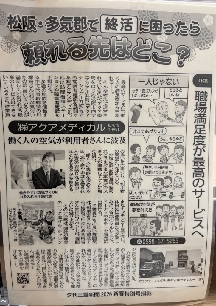 2026年1月 夕刊みえ 2026年2月26日 最終更新日時 : 2026年2月26日 aquamedical-staff 地元の新聞社、夕刊みえに取り上げて頂きました。 「終活」のコーナーで、介護施設、訪問看護サービス、キッチンカーを紹介しています。 4コマ漫画風にまとめてもらいました。
