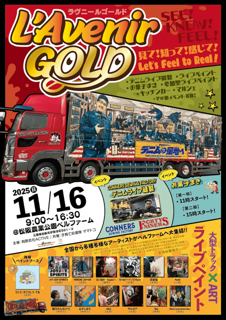 「トラックやトラックドライバーのこと、運送業界のことを多くの人に知ってもらいたい」普段トラックに触れる機会の少ない方にも実際に触れる機会をと、ベルファームで初開催!デニムライブ縫製・お菓子まき・キッチンカー・マルシェなど。ライブペイントでは全国から多種多様なアーティストがベルファームへ大集結‼体験ペイントブースも。